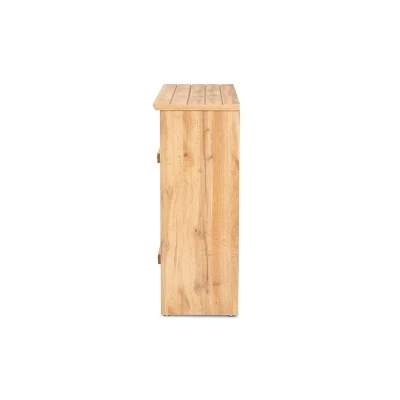 Imbue your dining room with the cozy farmhouse charm of the Eren sideboard. Made in Malaysia, the Eren is comprised of sturdy wood finished in a stunning natural oak brown hue. Four open shelves and three additional shelves, behind two doors, provide ample storage space to easily organize your plates, glassware, and more. Requiring assembly, the Eren is fitted with paneled wood doors that lend a cozy farmhouse aesthetic. Add utility and style to your dining space with the Eren sideboard.
