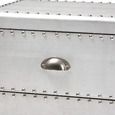 Bring chic French industrial style into your space with the Davet end table. Constructed from silver metal, the Davet features cool rivet detailing along its edges. Two drawers provide space to keep items organized and out of sight. Polished silver metal drawer pulls add a sleek touch. Inspired by vintage storage trunks, the Davet features corner protectors. Thick tapered feet complete the look. Use this stylish piece as an accent in the living room or any shared space. The Davet end table is made in China and will arrive fully assembled. Dimensions: 19.3″ High x 17.9″ Wide x 12″ Deep; Drawers: 5.5″ High x 13.4″ Wide x 9.1″ Deep