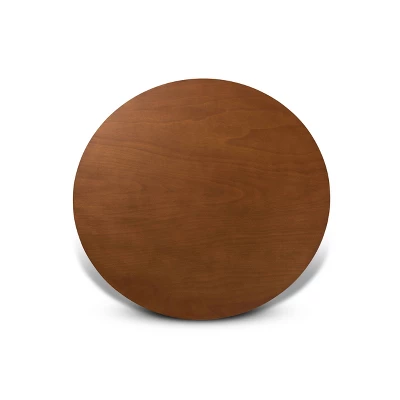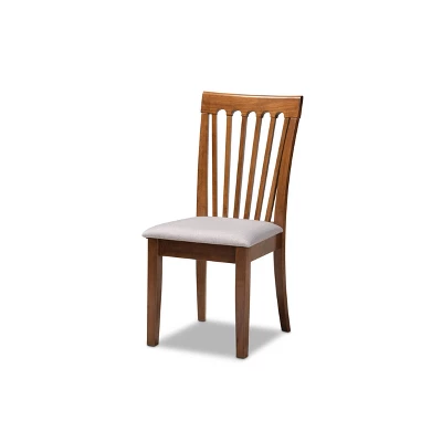 Sleek curves and a rich finish define the Lore dining set. Made in Malaysia, this wooden set includes one table and six chairs, each upholstered in a light fabric that complements the walnut brown wood finish. Designed for both comfort and style, each chair features a plush foam-padded seat, as well as an exquisite cut-out design on its back. The round tabletop is supported by splayed legs that form a unique sculptural base, creating a chic profile from any angle. Requiring assembly, the Lore dining set is well suited for both casual and formal dining. Chair Dimensions: 38.2″ high x 21.7″ wide x 18.5″ deep; Seating dimensions: 18.5″ wide x 16.1″ deep x 18.5″ high (from Floor); Back: 19.7″ high; Legs: 16.9″ high; Table Dimensions: 29.9″ high x 44.9″ wide x 44.9″ deep; Legs: 29.1″ high;
