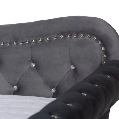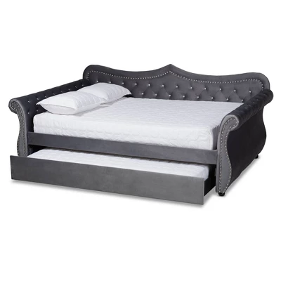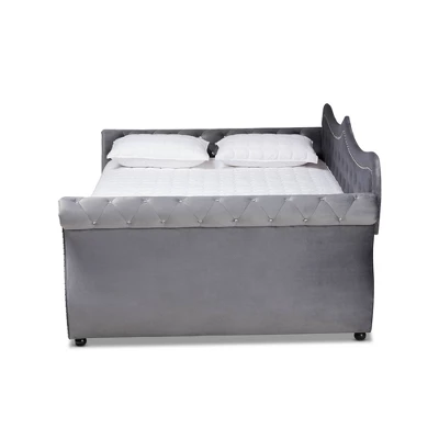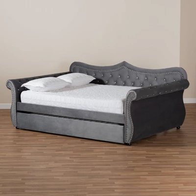 Lounge and sleep in glamorous style with the Abbie daybed. This versatile piece is made in Malaysia and fitted with a pull-out trundle to provide convenient accommodation for overnight guests. Its sturdy wooden frame is padded in foam and upholstered in a soft, sumptuous velvet fabric that provides ample comfort for resting. The Abbie daybed requires assembly and brings a classy touch to the modern bedroom or guest room. Crystal tufting adds charm, while silver metal nailheads accentuate the sweeping curves that define the elegant silhouette. Dimensions: 41.73″ High x 93.7″ Wide x 57.87″ Deep; Arms: 32.28″ High; Trundle: 76.77″ Wide x 40.94″ Deep x 11.42″ High; Trundle Maximum Mattress Height: 7.87″ High; Inside Dimensions (Mattress Size): 54″ Wide x 74″ Deep