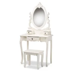 2pc Veronique White Finished Wood Vanity Table With Mirror And Ottoman White – Baxton Studio