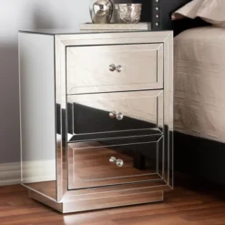 Baxton Studio Nouria Mirrored 3 Drawer Nightstand Bedside Table Silver – BaxtonStudio