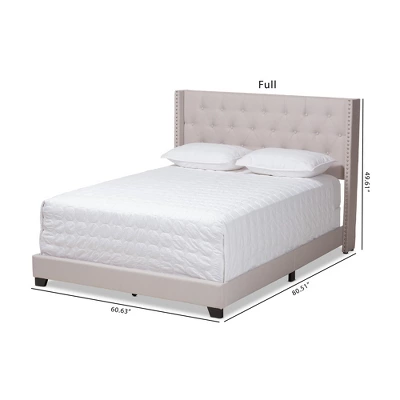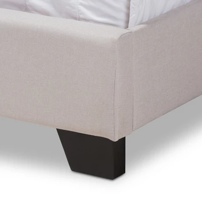 Add a chic, sleek vibe to your bedroom or guest room with the Brady bed. The modern and contemporary-inspired design is evident in the clean lines and chic details of the bed. The Brady’s frame is built to last with a rubberwood and poplar construction. The feet of the bed are finished in , complementing the neutral fabric upholstery of the frame and headboard. The headboard of the Brady features a straight headboard silhouette and wings for an eye-catching look. The headboard also features button-tufting and chrome finished nail head trim on the wings. The Brady is made for use with a box spring and mattress. Made in Malaysia, the bed requires assembly.