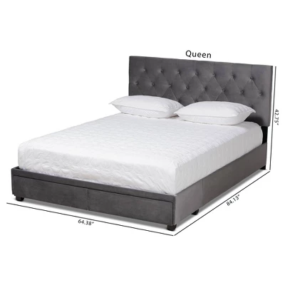 Transform your bedroom into a glamorous sanctuary with the Caronia bed. This chic bed is upholstered in a lavish velvet fabric that provides ample comfort for you to lean against as you read or watch TV. Button tufting on the headboard adds an extra dose of elegance and accentuates the stunning sheen in the velvet. Black feet complete the look. Stylish and practical, the Caronia is fitted with two drawers at the footboard with space to store clothes, sheets, and more. The Caronia bed is made in Malaysia and requires assembly. Dimensions: 46.26″ high x 84.65″ wide x 80.12″ deep; Headboard: 24.41″ wide x 80.12″ long x 2.76″ thick; Distance between slats: 5.98″; Height from floor to top of slat: 10.63″ high; Legs: 2.36″ high; Drawers: 38.43″ wide x 18.5″ deep x 5.31″ high; Inside dimensions (mattress size): 76″ wide x 80″ deep