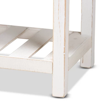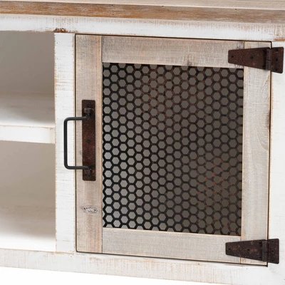 Create a stunning focal point in your kitchen or dining room with the Deacon sideboard. Made in China, the Deacon is comprised of a sturdy wood frame showcasing a lightly weathered two-tone white and oak brown finish for an aged look. Three shelves and two compartments behind doors provide ample storage space for plates, glassware, and more. Requiring assembly, the lower shelf features slatted wood for a visually striking and efficient design. Antique black rust tone metal accents lend an industrial touch, making the Deacon sideboard a distinctive addition to the modern home. Dimensions: 32.5″ High x 48″ Wide x 13.8″ Deep; Storage: 14.5″ High x 14.25″ Wide x 12.5″ Deep; Top Shelf: 7.25″ High x 15.5″ Wide x 12″ Deep; Bottom Shelf: 6.75″High x 15.5″ Wide x 12″ Deep; Rack Shelf: 13″ High x 46″ Wide x 13″ Deep; Legs: 2.8″ High;