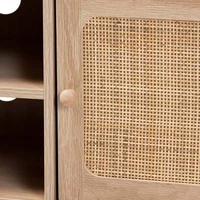 Exemplary of classic design, the Elsbeth TV stand offers fantastic efficiency in robust style. Made in China, this mid-century inspired piece is comprised of a sturdy wood frame and supports televisions measuring up to 46 inches. Two open shelves serve as a convenient display for media devices, while two additional shelves behind the doors accommodate larger items. The Elsbeth requires assembly and features two cord management holes on its back panel for easy setup of electronics. Round drawer knobs coupled with woven natural rattan lend a unique visual geometry, making the Elsbeth TV stand an alluring focal point in any layout.