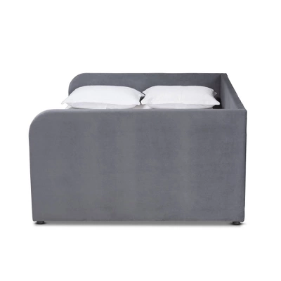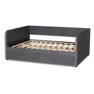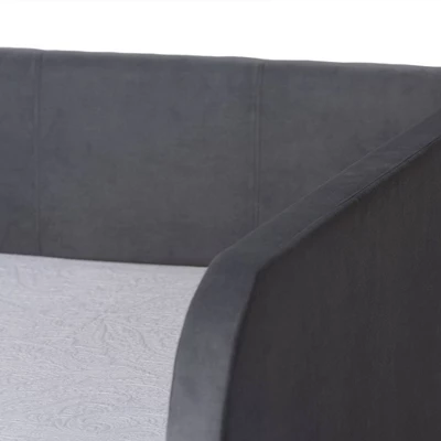 Endow your personal getaway with the fantastic versatility of the Basanti daybed. Made in Malaysia, this exquisite piece is comprised of a solid wood frame padded with foam and upholstered in lustrous velvet fabric. Two drawers provide a convenience storage area for sheets, clothes, and more. The Basanti requires assembly and utilizes wood slats for mattress support, eliminating the need for a box spring. The smooth curves of the arms create a sleek outline, making the Basanti daybed an easy and efficient addition to any bedroom space. Overall Bed Dimensions: 85.00″ W x 58.50″ D x 36.50″ H; Inside Dimensions/Mattress Size Fit: 76.00″ W x 54.70″ L; Storage: 37.50″ W x 31.30″ D x 10.50″ H; Arm Height from floor to top of Side Panel: 13.80″; Clearance/Bed Legs: 1.00″ H;