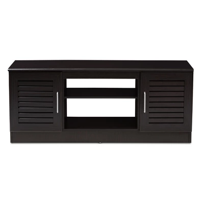 Make the focal point of your livingroom a stylish spot with the Gianna TV stand. The modern and contemporary-inspired design features a clean, rectangular silhouette. The Gianna is finished in a wenge , mait easy to coordinate with a wide range of decor. The TV stand has a wide top space, ideal for multiple television set sizes. The Gianna has two open shelf spaces in the center, flanked by two more shelves behind doors. The doors feature a horizontal, slatted design, with silver finished door handles. All of this shelf space makes it easy to store entertainment media, such as DVDs and video games. Practical, stylish, and with plenty of open space for cord management, the Gianna can easily bring together your living room, rec room, or gaming set-up. Made in Malaysia, this TV stand requires assembly. Dimensions: 19.69″ High x 47.24″ Wide x 15.75″ Deep