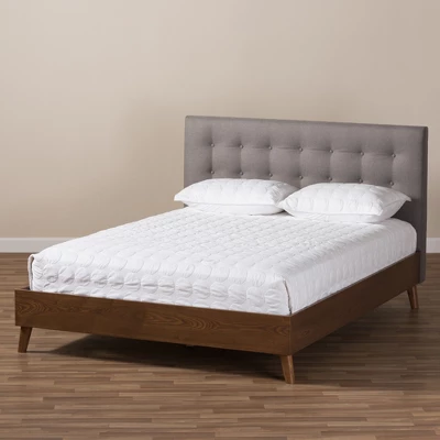 The Alinia fabric upholstered platform bed in has a beautiful walnut veneer finish that will bring a touch of elegance to your room. The large fabric upholstered, tapered headboard with its button-tufting design is the focal point to this bed. The headboard of the Alinia brings focus to your surroundings as well as providing support when sitting up on your bed. The strong solid wood construction offers incredible durability while your comfort is enhanced by the superb slatted base. Inspired by Scandinavian mid-century modern design, the Alinia features splayed legs in the same walnut tone with the side rails and the low-end footboard. Sophisticated, sensuous and sumptuous, Alinia is the bed that stylish dreams are made of. Made in Malaysia, the Alinia requires assembly.