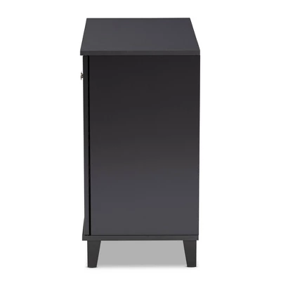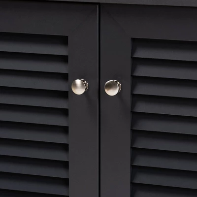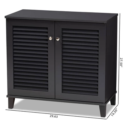 Store your shoes on the sly with the Coolidge shoe cabinet. Two slatted doors, fitted with round knobs, conceal four shelves with storage space for up to 12 pairs of shoes. Tapered legs add refined style and provide elevation to deter dust buildup. Constructed from engineered wood, the Coolidge showcases a sleek dark gray finish that complements any color scheme. The Coolidge shoe cabinet is made in Malaysia and requires assembly. Dimensions: 27.4″ High x 25.6″ Wide x 14.6″ Deep; Shelves: 4.3″ High x 27.6″ Wide x 11.4″ Deep; Legs: 3.5″ High