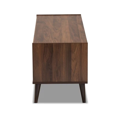 Keep you living room organized in style with the Suli TV stand. Made in Malaysia, this wooden TV stand features a walnut brown finish that creates a warm atmosphere. Two open shelves, fitted with a cord management hole, provide space to place entertainment consoles. One compartment, hidden behind a door, provides additional storage space. Tapered, splayed legs and a low profile lend a cool, retro look. Requiring assembly, the Suli TV stand enhances any space. Dimensions: 17.5″ high x 47″ wide x 15.7″ deep; Legs: 5.9″ high;