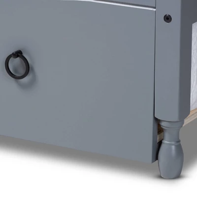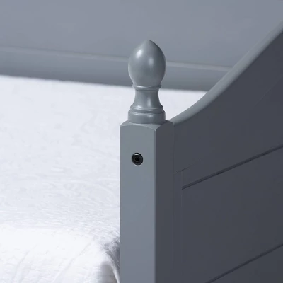 Hosting sleepovers is easy with the charming Mara daybed. This versatile piece is fitted with a pull-out trundle to provide convenient accommodation for overnight guests. Its sturdy wood construction ensures durability, while its classic gray finish makes it easy to coordinate with any existing color palette. Inspired by farmhouse design, the Mara features curved panels enhanced by inset detailing and topped with elegant finial posts. Black metal ring pulls and exquisitely molded feet complete the look. The Mara daybed is made in Malaysia and requires assembly.